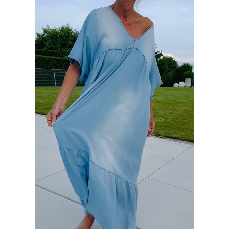 DŁUGI DEKOLT W SZPIC – PŁASKI I ZWIEWNY STYL: Ta długa sukienka z głębokim dekoltem w szpic tworzy elegancką sylwetkę i zapewnia dodatkową oddychalność. Idealna na ciepłe dni lub w połączeniu z dodatkami, subtelnie, lecz stylowo zwraca uwagę na dekolt. Niezależnie od tego, czy wybierasz się na plażę, czy na niezobowiązujące spotkanie, dekolt w serek dodaje kobiecego charakteru, nie rezygnując z wygody