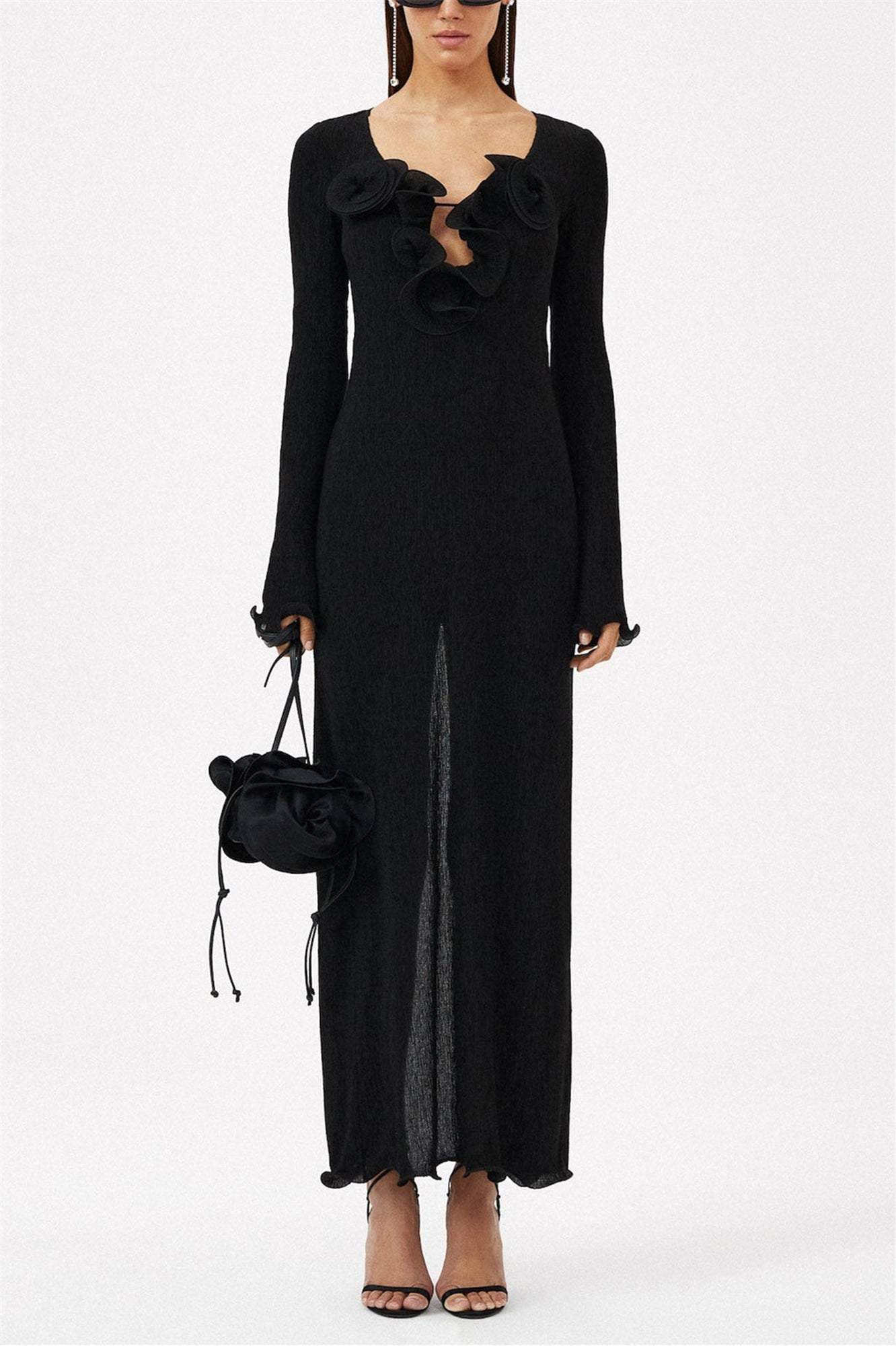 - Długi rękaw, dekolt w kształcie litery V, trójwymiarowy kwiat, rozcięcie, sukienka maxi, jednolity kolor