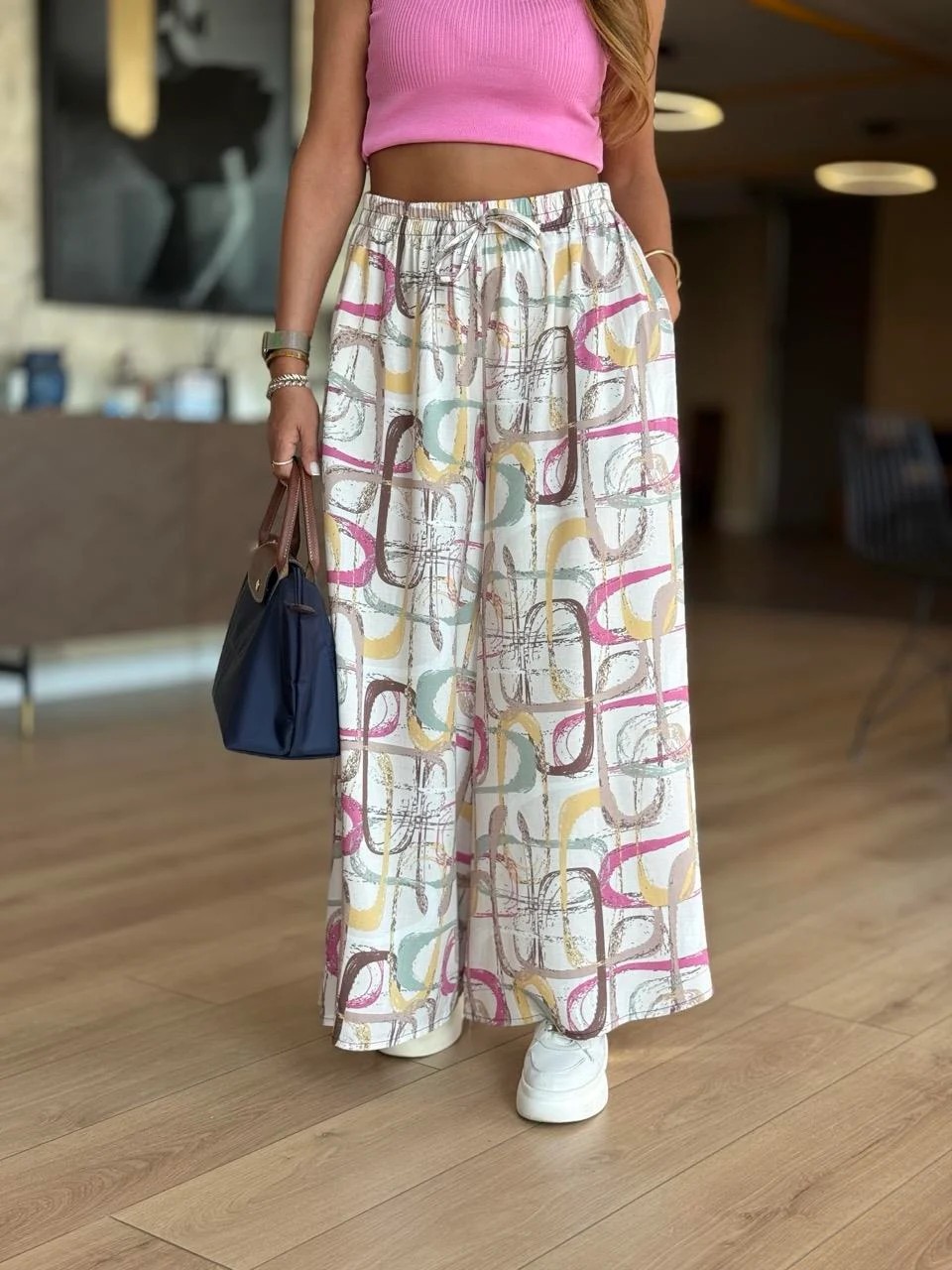 STYLOWE I UNIWERSALNE NADRUKI: Dzięki stylowym nadrukom na całej powierzchni i modnym szerokim nogawkom spodnie te można łatwo łączyć z koszulkami, topami i innymi strojami na każdą okazję.